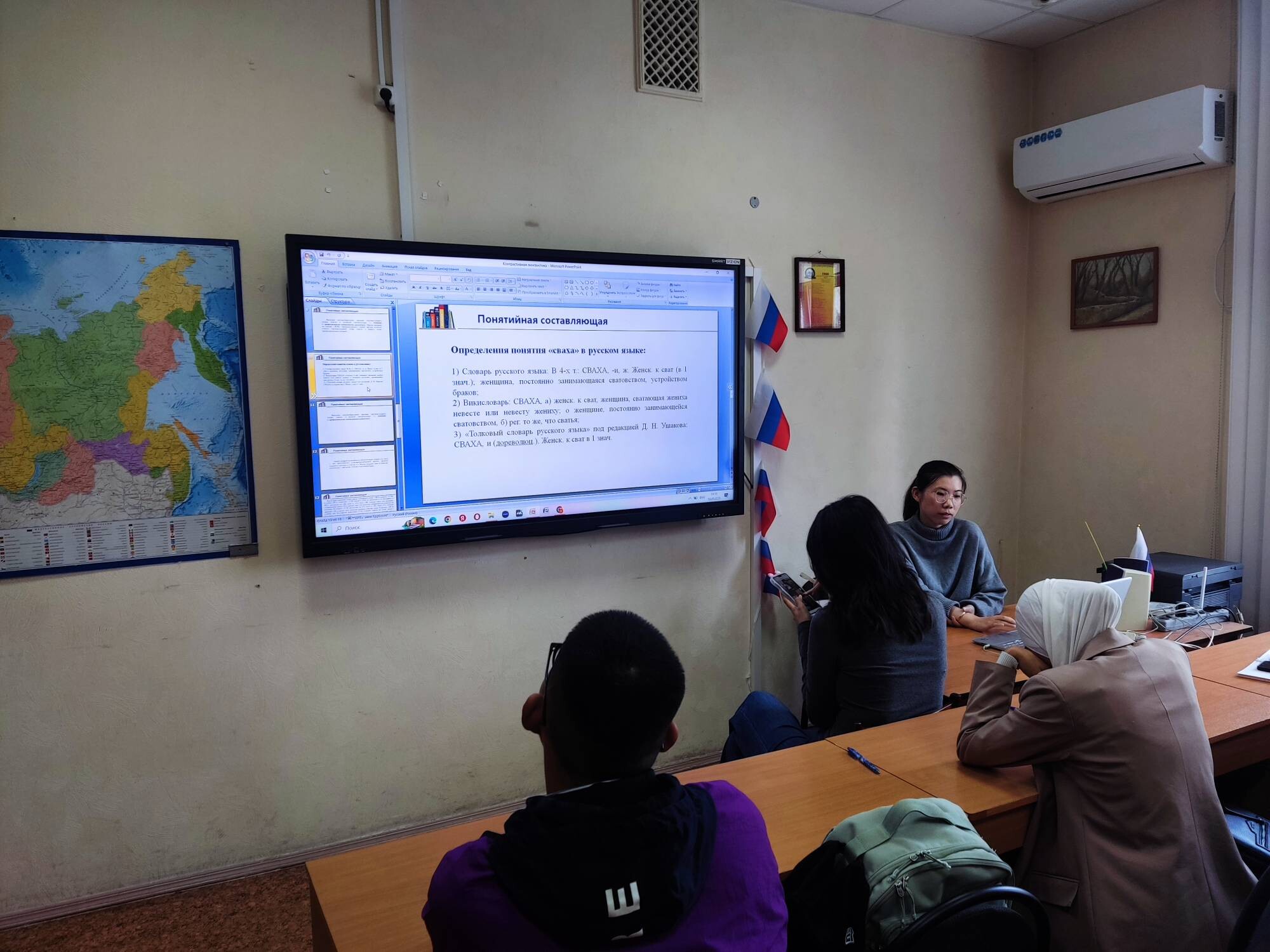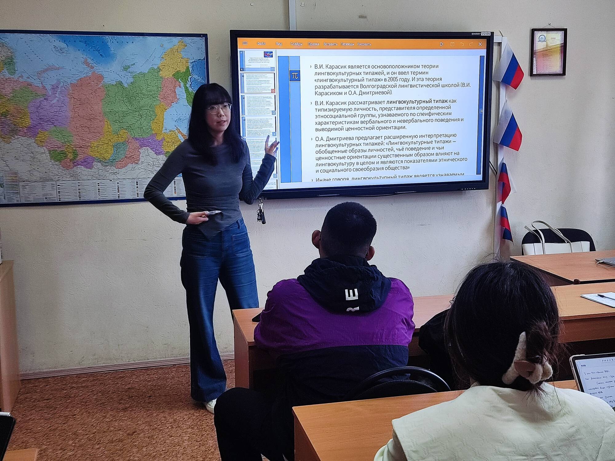 Очередное мероприятие в рамках проекта было посвящено лингвокультурологическим исследованиям. Китайские аспиранты 2-го года обучения выступили с презентациями своих научных работ. Они представили глубокий анализ таких интересных социокультурных феноменов, как «Лингвокультурный типаж "сваха"» и «Лингвокультурный типаж "трудоголик"».