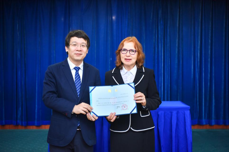 От имени Пекинского педагогического университета Чэнь Син вручил Татьяне Кортава звание «Почетный профессор ППУ». На протяжении многих лет Татьяна Владимировна оказывала значительную поддержку работе Научно-исследовательского центра изучения России ППУ и Совместного центра развития преподавателей русского языка, активно способствуя сотрудничеству между двумя университетами в научно-исследовательской, преподавательской и культурной сферах.